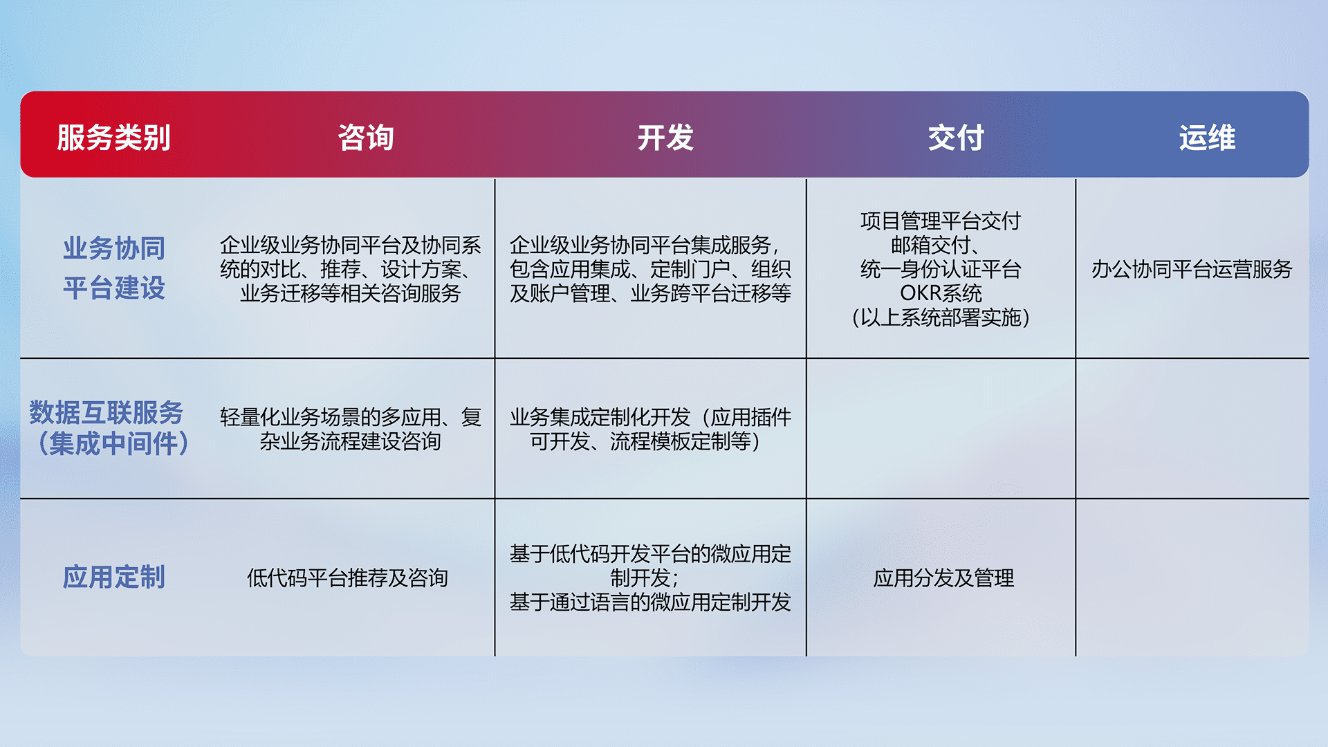 针对钉钉、、、、企微、、IDaas等平台级产品提供产品的规划、、、方案、、、、交付、、定制化开发等服务,,,实现如统一协同办公、、智能客户服务、、混合会议管理、、、、智能数据查询、、、等业务场景,,,实现数字化转型。。。