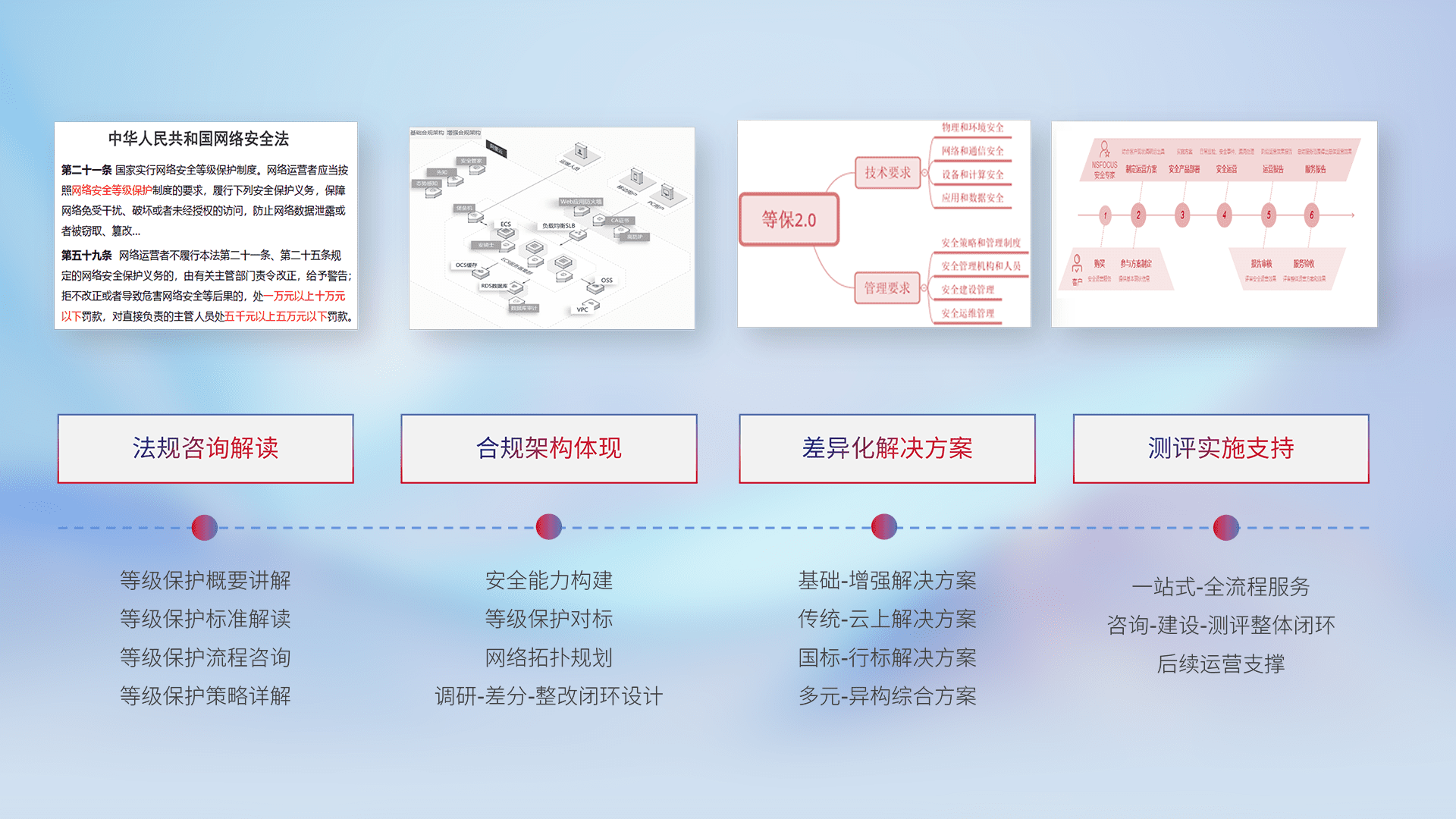 通过专业的法律咨询解读、、合规架构体现、、、、差异化解决方案、、、、测试实施支持等服务,,为客户量身打造等保合规体系。。