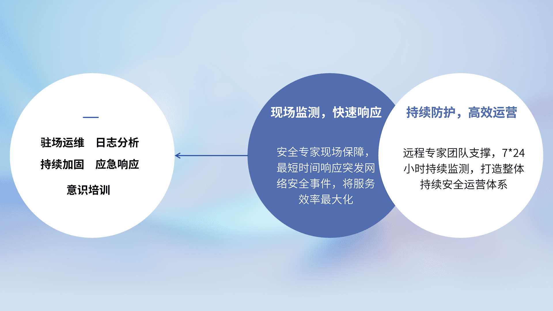 7X24小时持续监测安全事件,保持安全策略有效性,降低资产脆弱性风险,,精准拦截黑客攻击,,,减少被黑客利用的机会,,,第一时间遏制,,,,降低损失。。